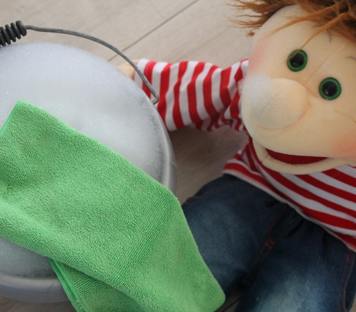Dit verhaal gaat over poetsen. Het gaat over verschillende klusjes die thuis regelmatig aan bod komen. Ze zijn bekend voor het kind. De begrippen uit het verhaal kunnen thuis ook gebruikt worden, laat het kind eens meehelpen met stofzuigen, laat het afwassen of met de luchtverfrisser spuiten in het toilet.
